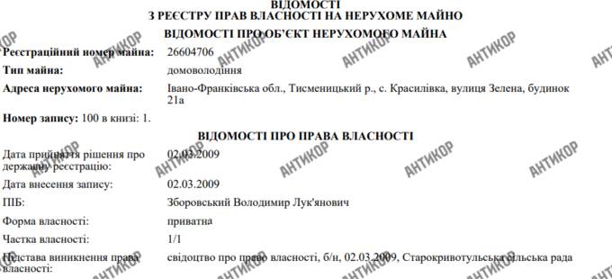 Офіційною адресою реєстрації Михайла Зборовського є будинок у селі Красилівка Івано-Франківської області. Щоправда, власником дому є його батько.
